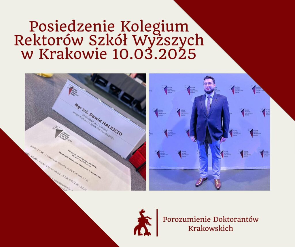 W dniu 10.03.2025 przewodniczący Porozumienia Doktorantów Krakowskich mgr inż. Dawid Halejcio miał zaszczyt uczestniczyć w posiedzeniu Kolegium Rektorów Szkół Wyższych w Krakowie.![]()